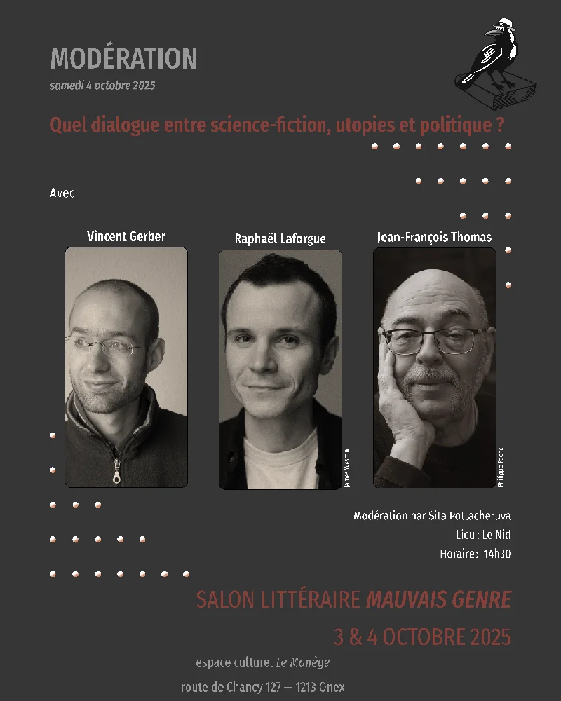 Un échange riche entre les réflexions tirées de l’essai de Vincent Gerber: «L’imaginaire au pouvoir», prix de la SGE, 2023, l’utopie décalée de Raphaël Laforgue: «L’île de Clipperton» et le recueil de récits de science-fiction de Jean-François Thomas: «Magiciennes dentelées»: des auteurs qui développent un bel esprit critique, voire ironique!